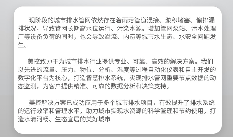 美控解決方案已成功應(yīng)用于多個城市排水項目,有效提升了排水系統(tǒng)的運行效率和管理水平,助力城市實現(xiàn)水資源的科學管理和節(jié)約使用,打造水清河暢、生態(tài)宜居的美好城市